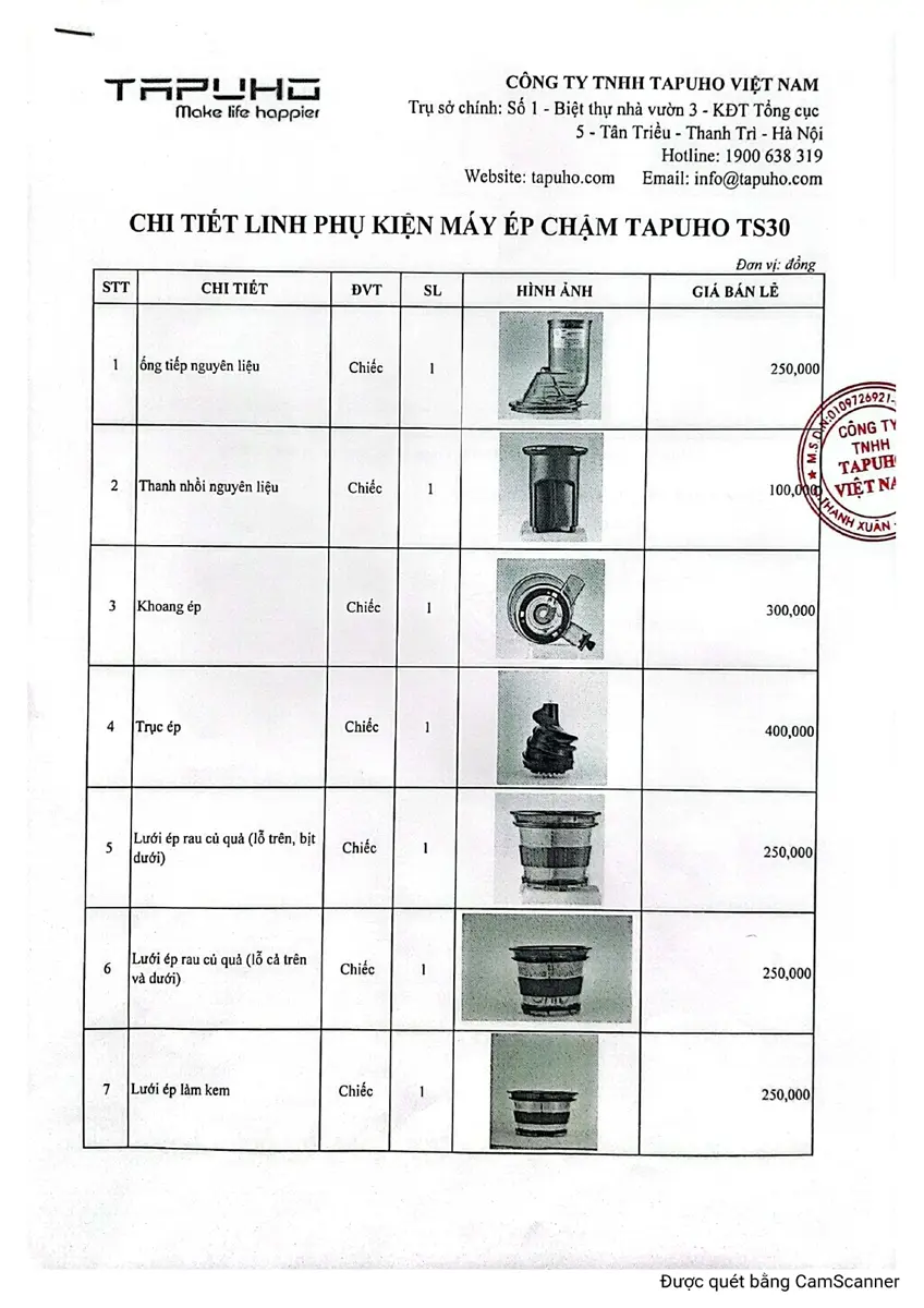 Dưới đây bảng giá Phụ kiện máy ép chậm TS30 TAPUHO công khai: