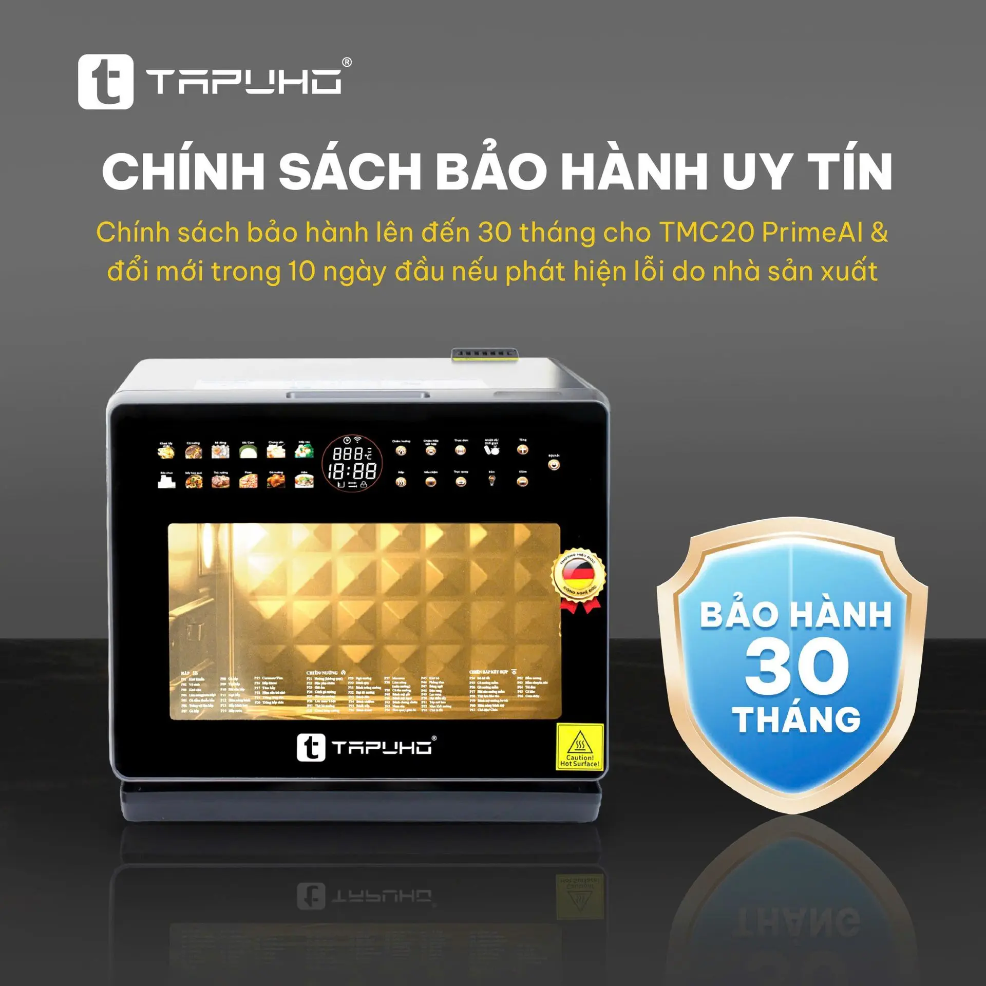 TAPUHO cung cấp chính sách bảo hành lên đến 30 tháng cho TMC20 PrimeAI và đổi mới trong 10 ngày đầu nếu phát hiện lỗi do nhà sản xuất. Mỗi sản phẩm ra khỏi nhà máy đều được kiểm tra nghiêm ngặt theo tiêu chuẩn Châu Âu.