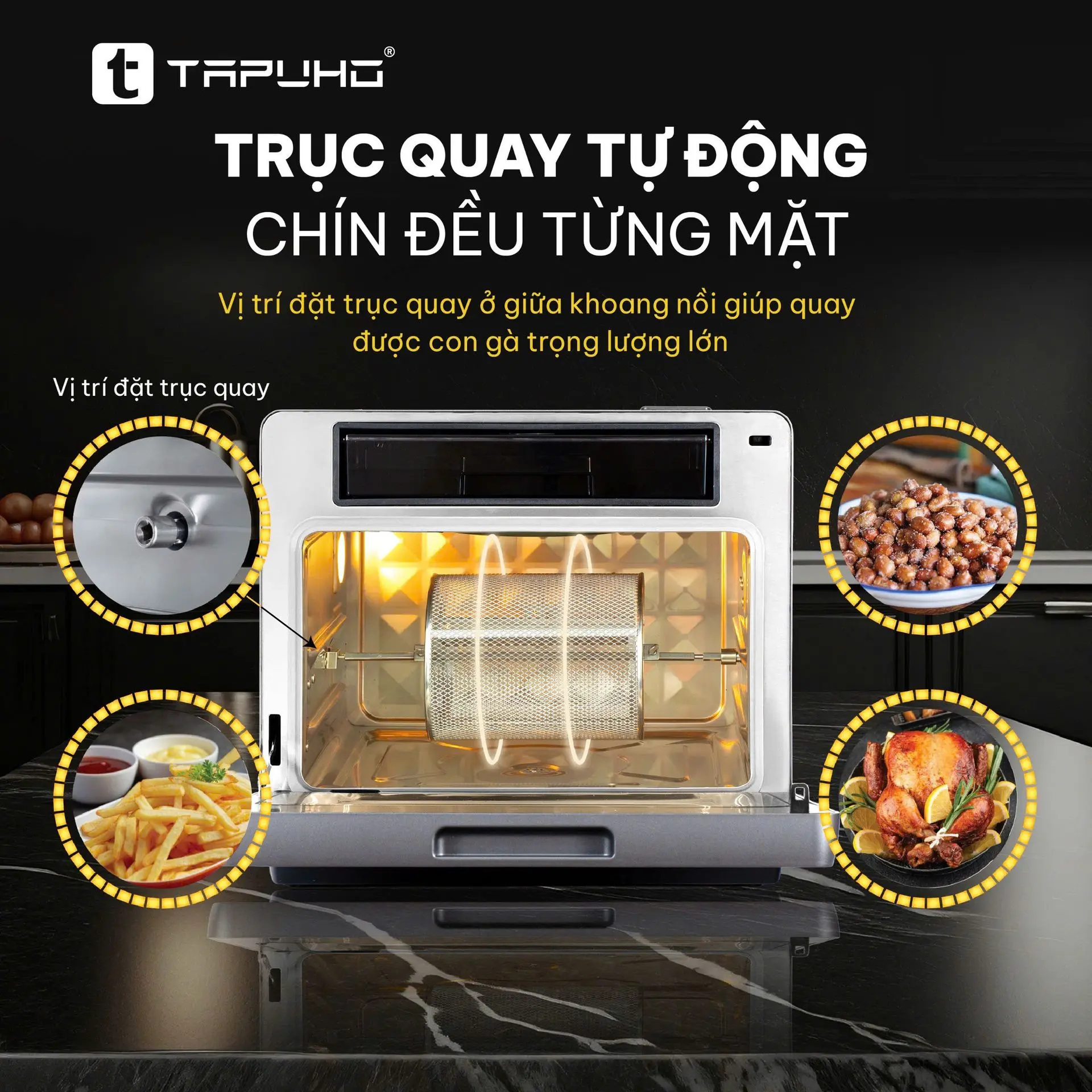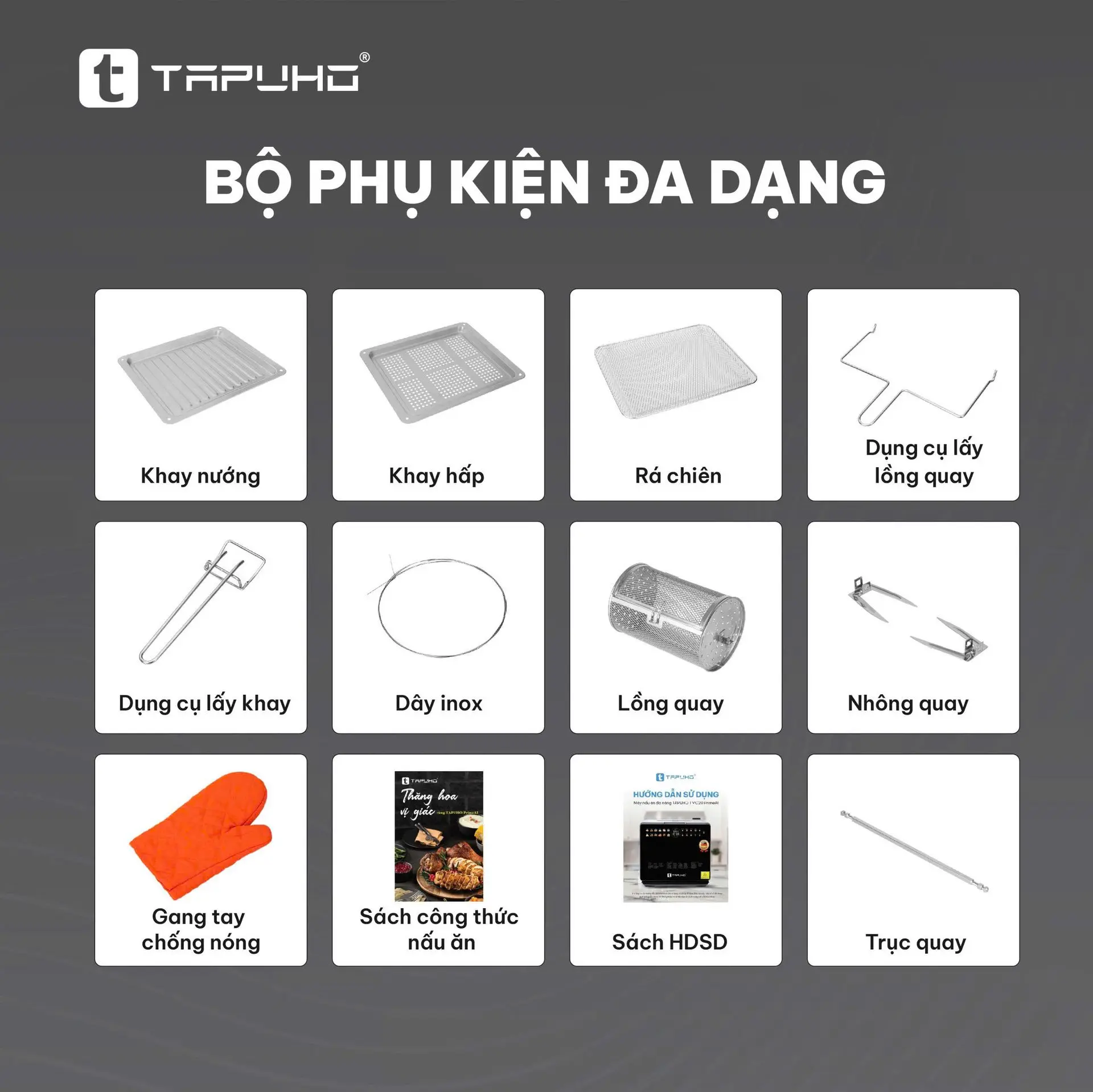 Khi mua TAPUHO TMC20 PrimeAI, người dùng nhận ngay bộ phụ kiện inox 304 cao cấp gồm: khay hấp, khay nướng, rá chiên, trục quay, giỏ quay, nhông quay, dây buộc gà, dụng cụ lấy khay, găng tay chống nóng, cùng sách công thức nấu ăn.