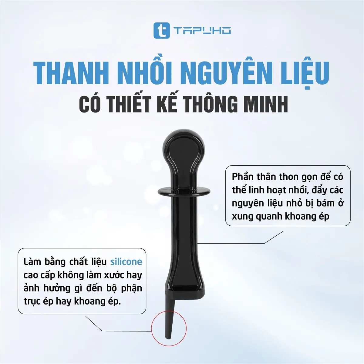 Thanh nhồi nguyên liệu có phần thân thon gọn để có thể linh hoạt nhồi, đẩy nguyên liệu bị bám ở xung quanh khoang ép và đặc biệt phần cuối của thanh nhồi được làm bằng chất liệu silicone cao cấp không làm xước hay ảnh hưởng gì đến bộ phận trục ép hay khoang ép.