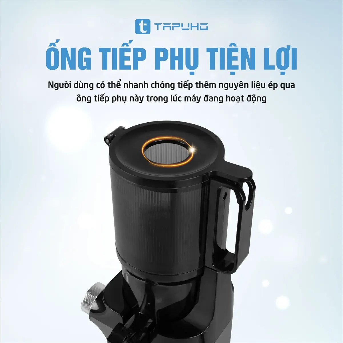 Người dùng có thể nhanh chóng tiếp thêm nguyên liệu ép qua ông tiếp phụ này trong lúc máy đang hoạt động.